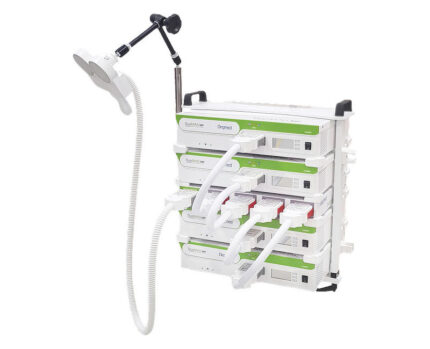 Carro MagTower con innovador brazo de posicionamiento equilibrado de contrapeso y autobloqueo de posición que reduce en gran medida el esfuerzo necesario para encontrar y fijar la colocación de las bobinas Deymed.